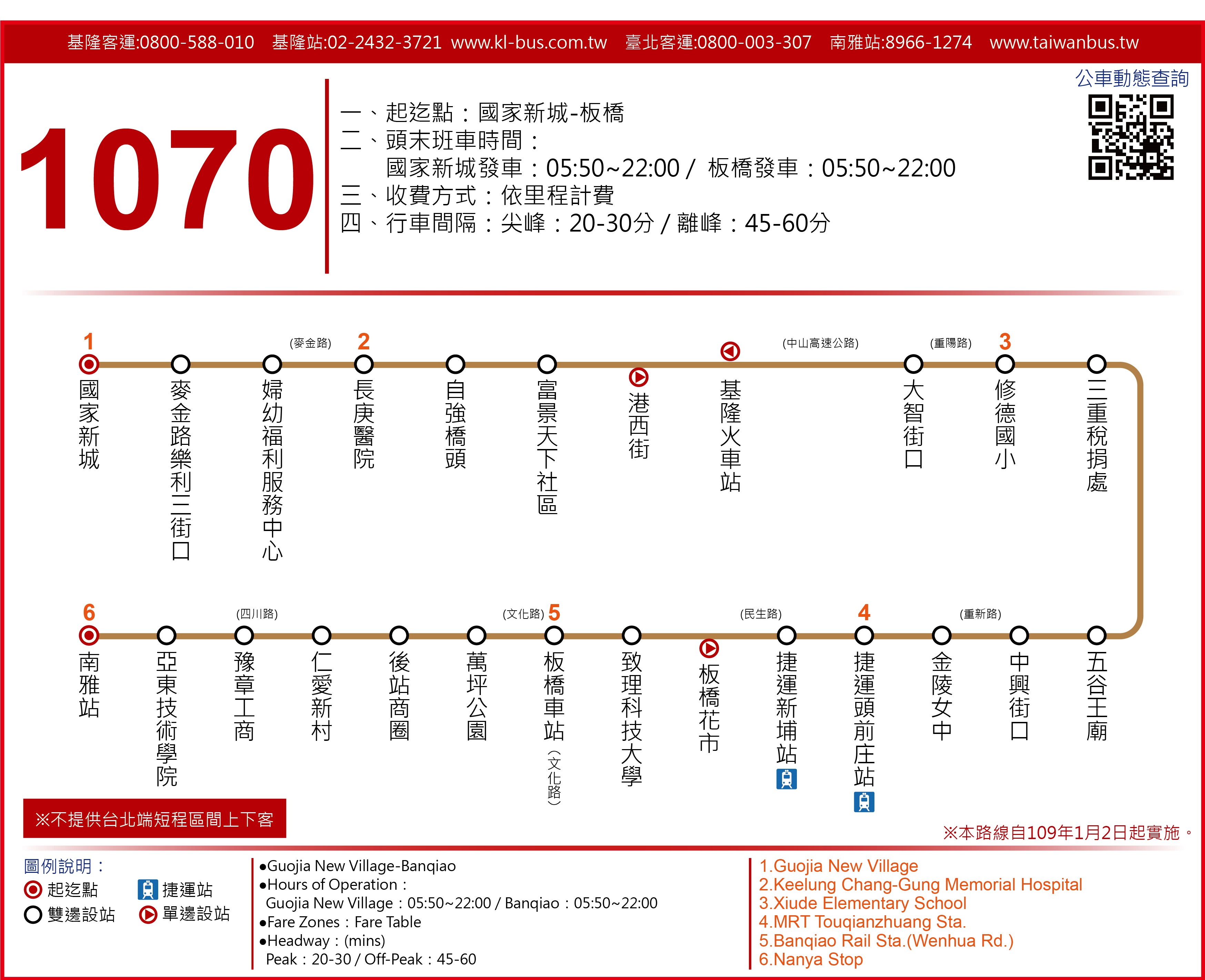 - ↑ 本公司“【1070】新北市板桥-基隆市”路线,于113年5月1日起时刻表调整